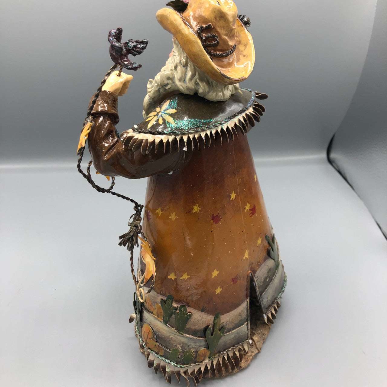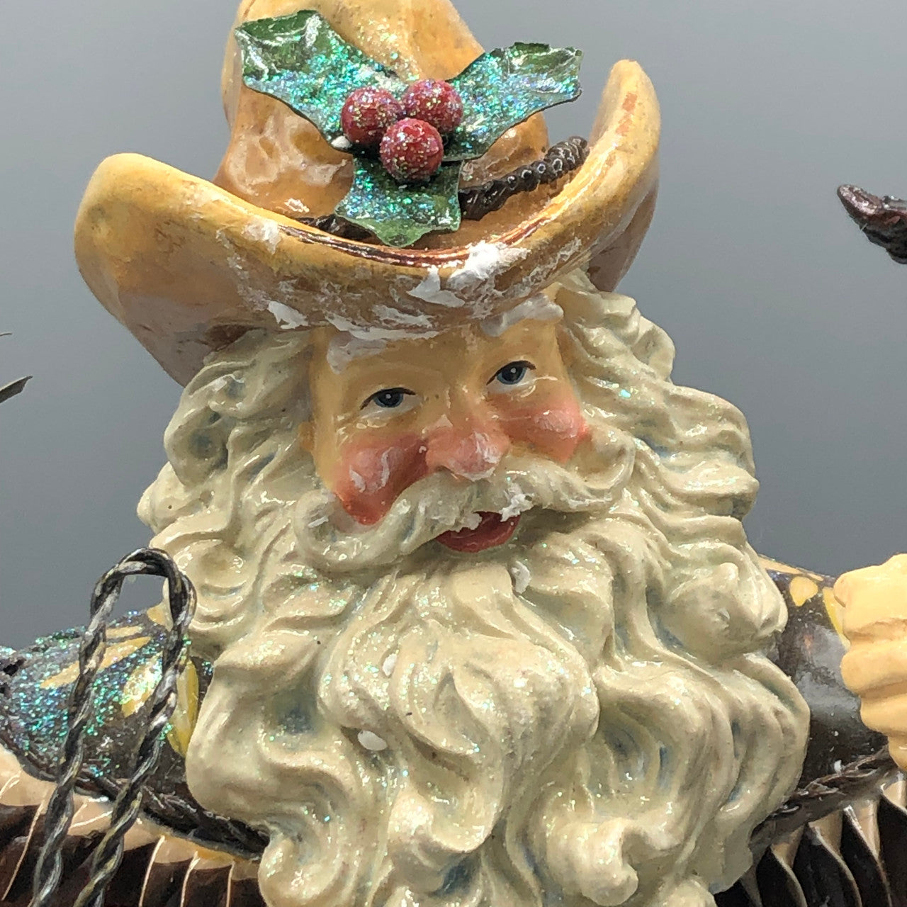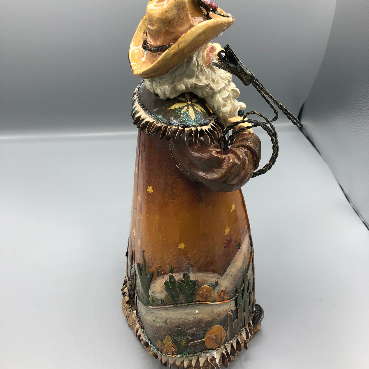 Western tall Lasso Santa that is definately a conversation starter. The jacket is metal and has a nice desert scene with cactus and stars. The outfit is very detailed and the colors are brilliant. The lasso is detailed with 2 birds and stars. Santa's face is sweet with his rosy cheeks. This is a well made piece that would look amazing in a cabin or holiday table. No paint loss or imperfections on the piece.