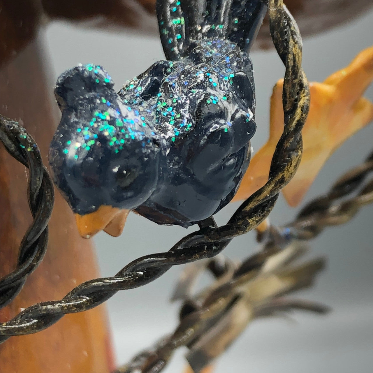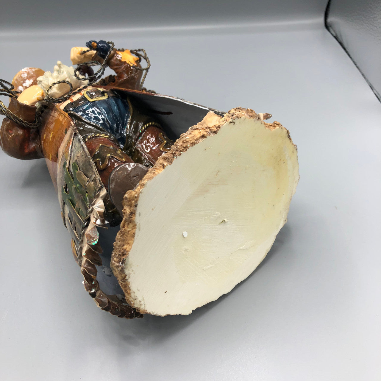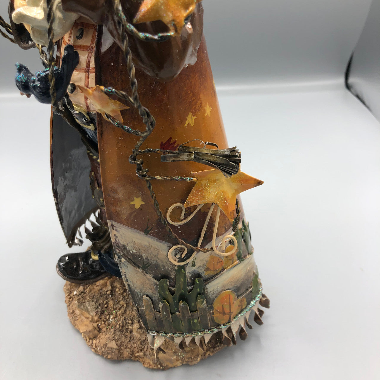 Western tall Lasso Santa that is definately a conversation starter. The jacket is metal and has a nice desert scene with cactus and stars. The outfit is very detailed and the colors are brilliant. The lasso is detailed with 2 birds and stars. Santa's face is sweet with his rosy cheeks. This is a well made piece that would look amazing in a cabin or holiday table. No paint loss or imperfections on the piece.